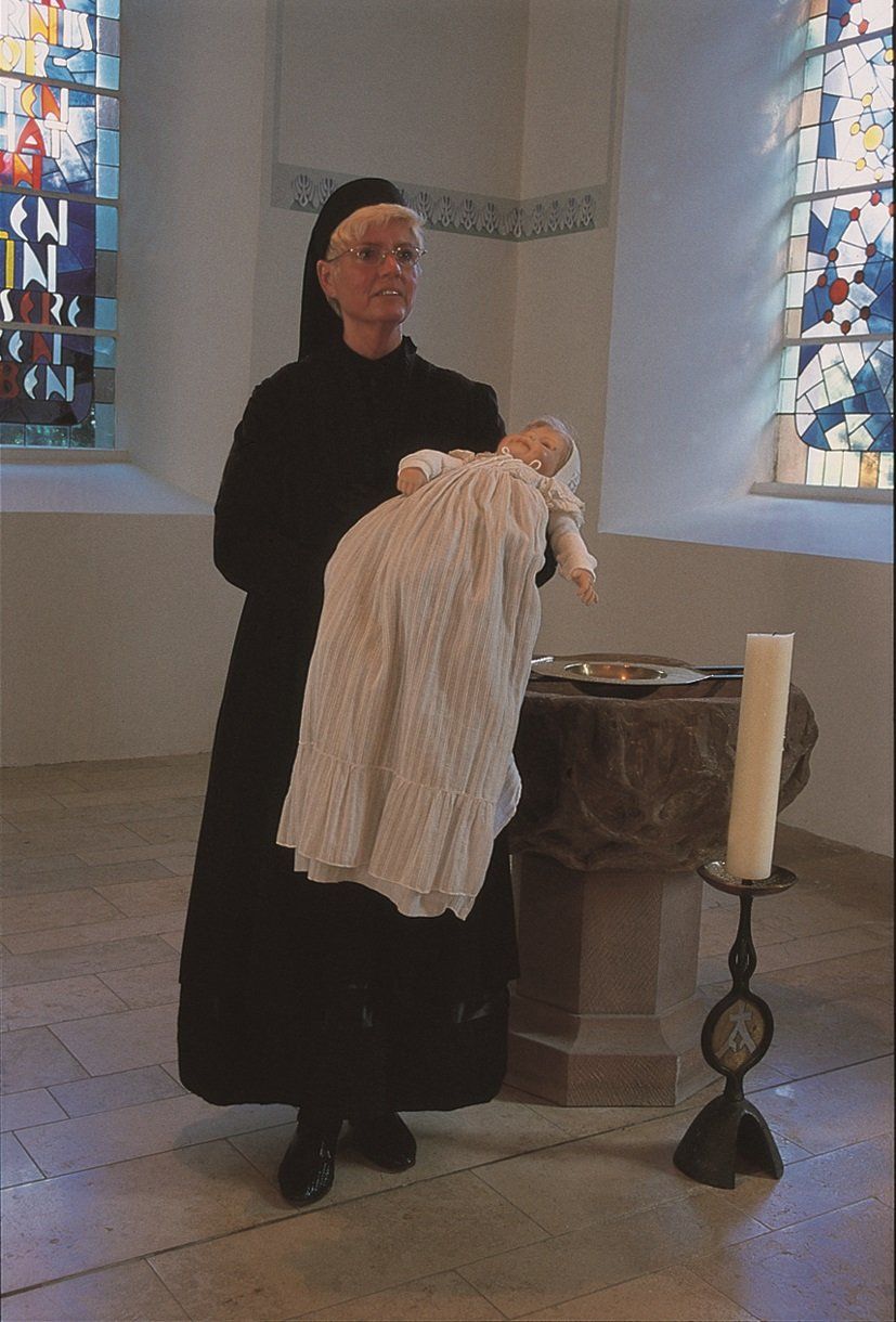 Zur Taufe verwendete man über Generationen hinweg ein Taufkleidchen mit gehäkelter oder gestrickter Spitzenhaube. Die Hebamme trug den Täufling im schwarzen Hebammenmantel auf einem Kissen zur Taufe.